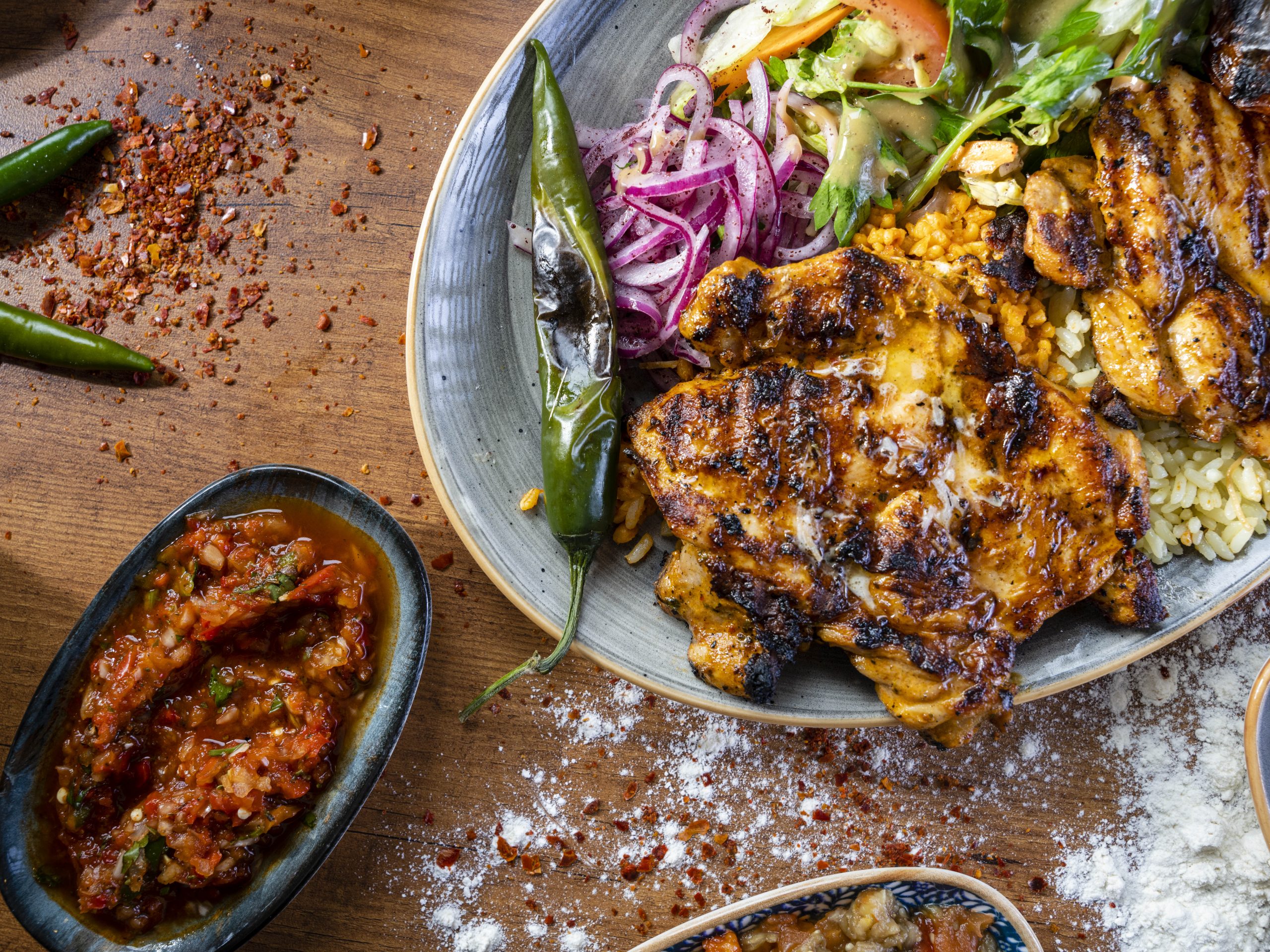 auf Reis/Bulgur dazu Ezme, Joghurt und frischer Salat