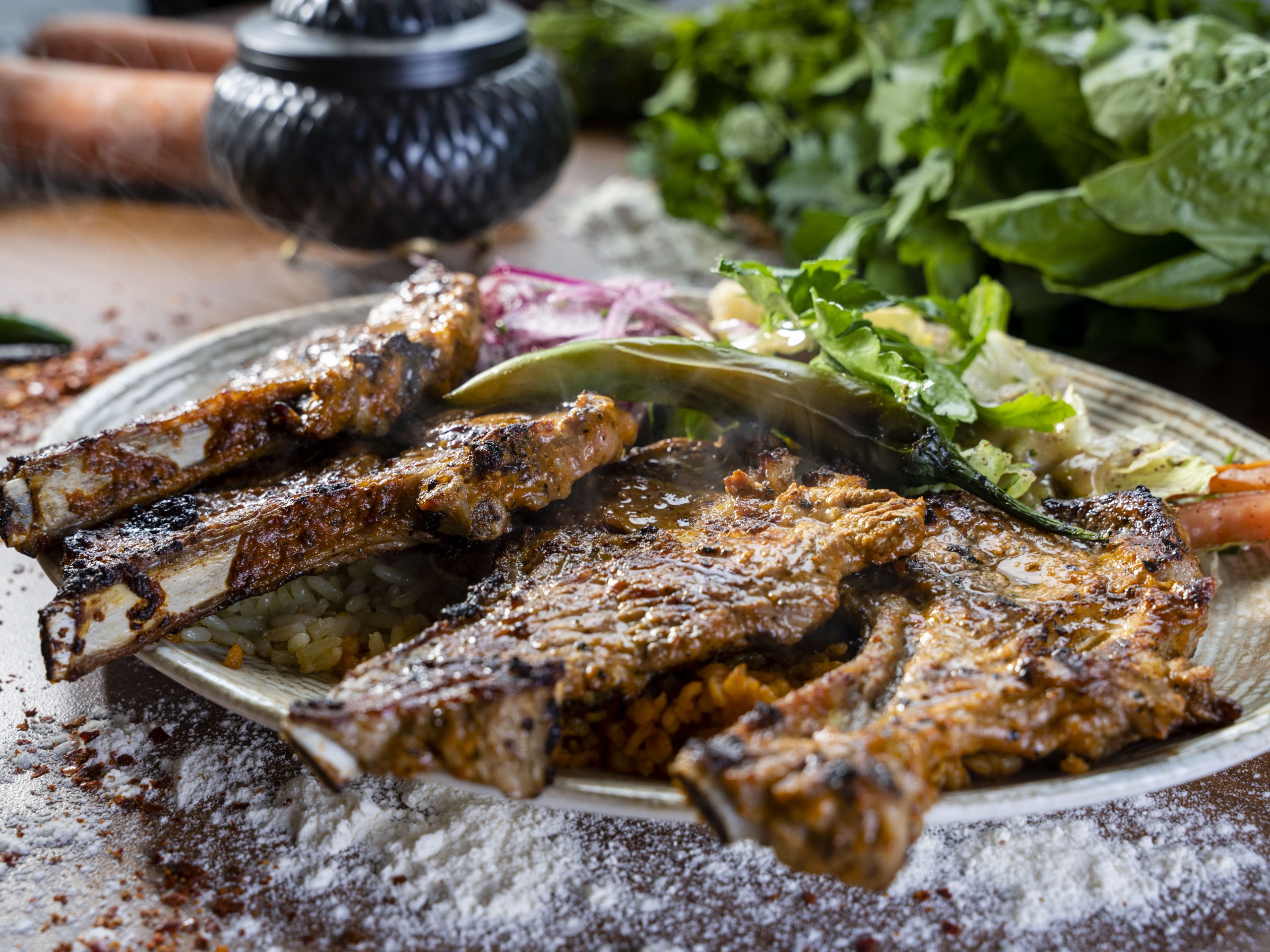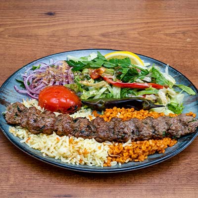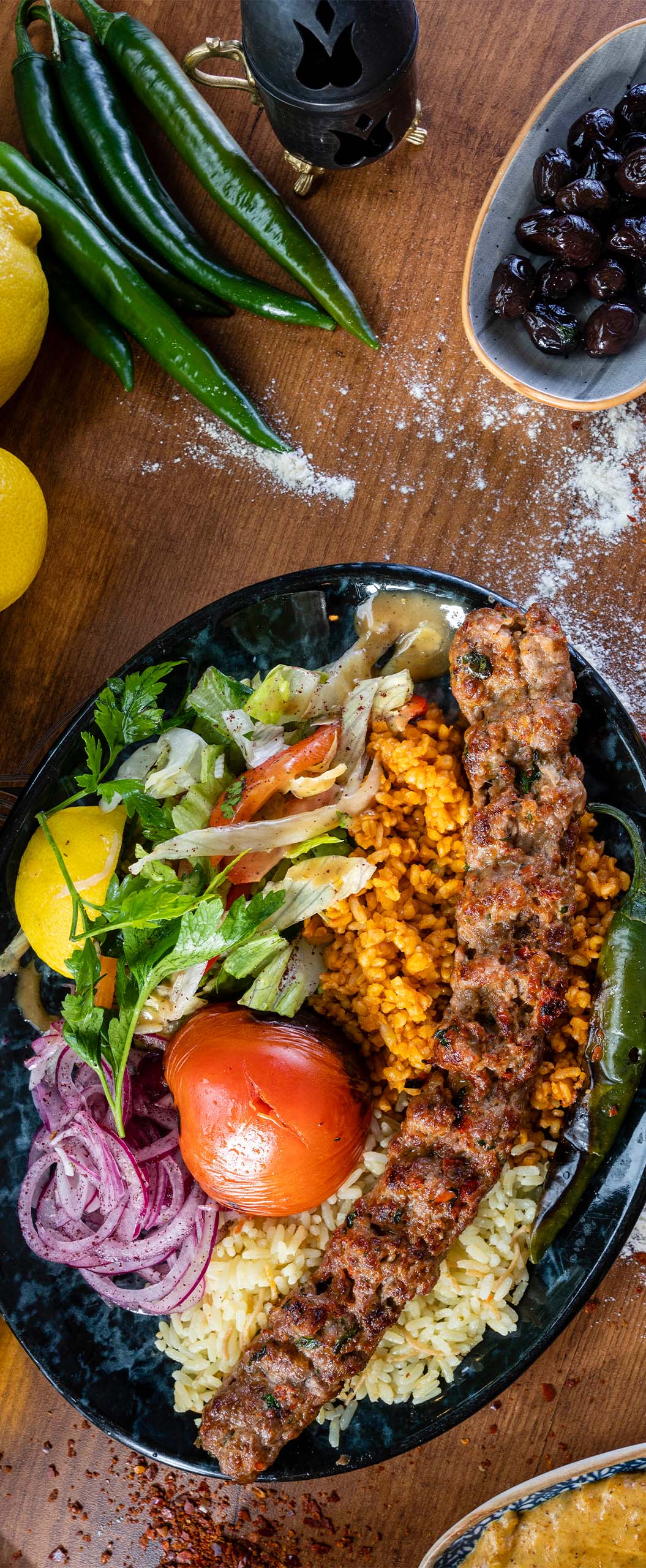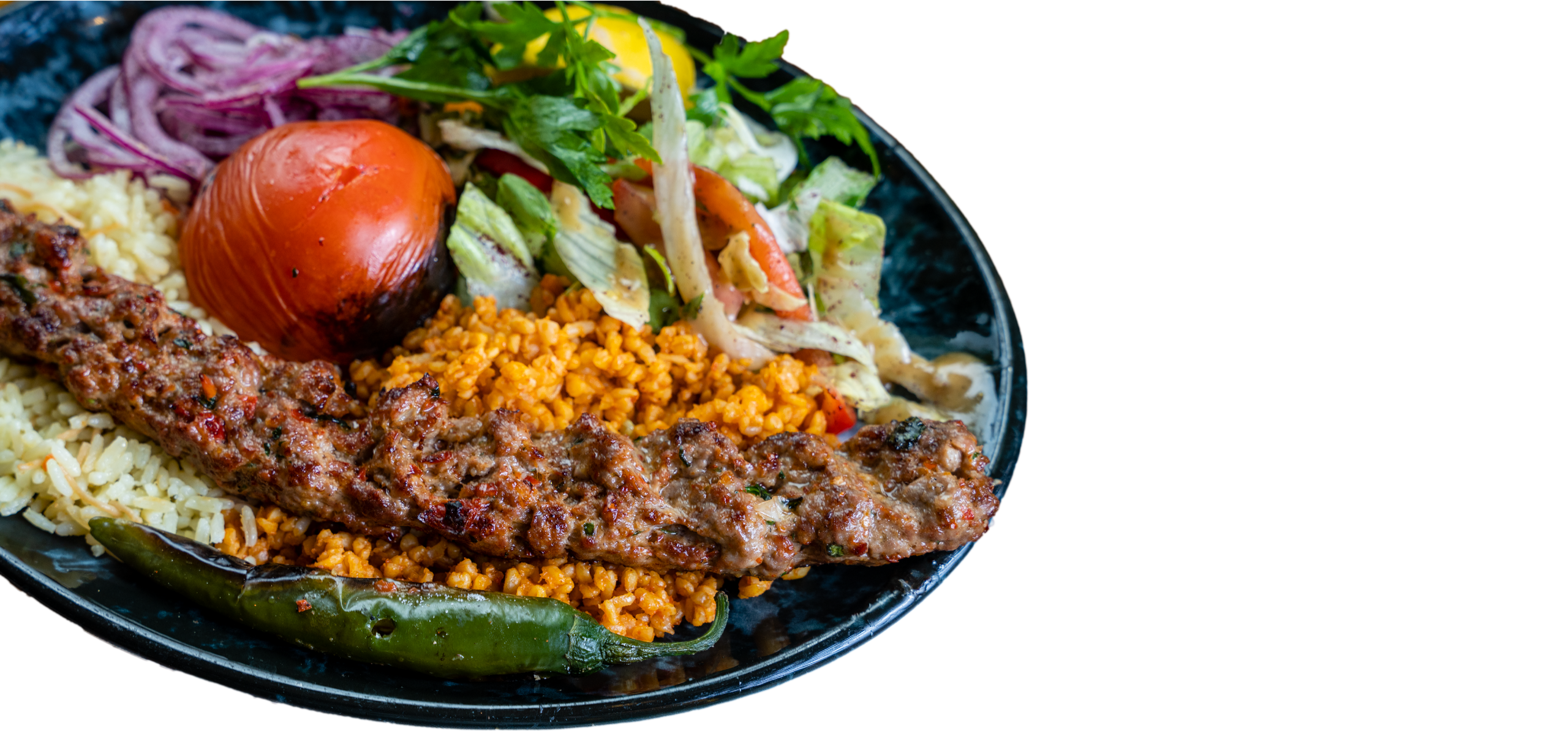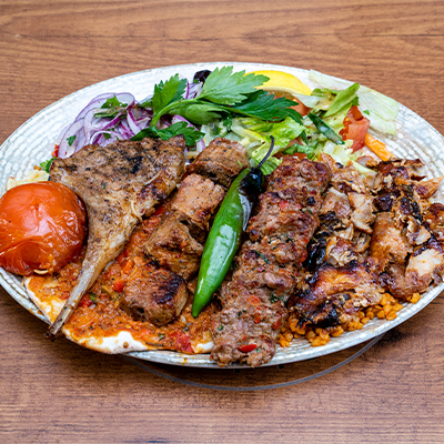 Lammkoteletts, Sis Kebab, Adana Kebab, Döner auf Reis, Findik Lahmacun, Ezme, Joghurtdip und frischer Salat